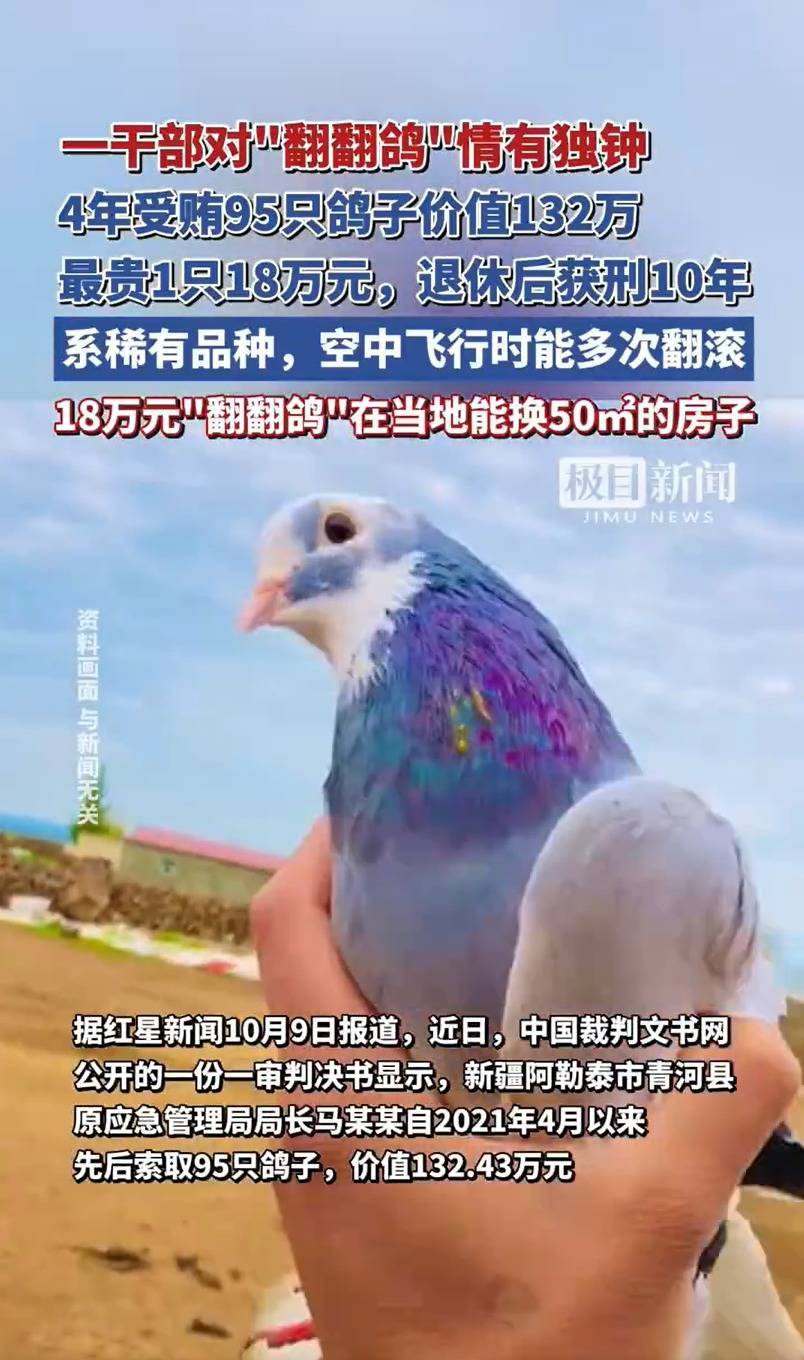 近日,中国裁判文书网公开的一份一审判决书显示,新疆阿勒泰市青河县原应急管理局局长马某某自2021年4月以来,先后索取95只鸽子,价值132.43万元,占其索贿受贿总额的54.63%。