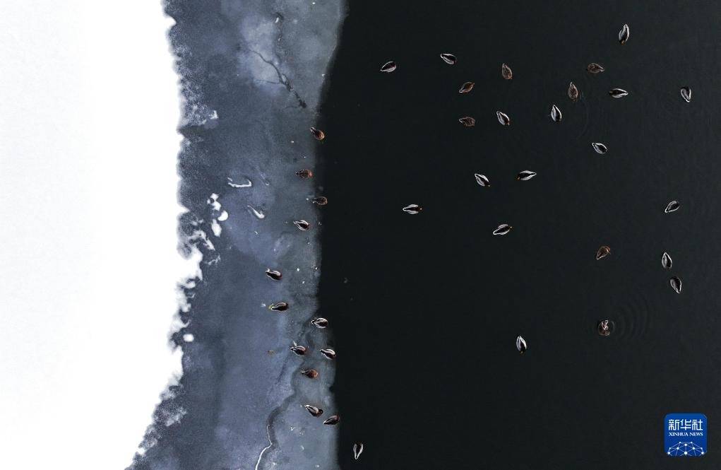 11月27日在松花江哈尔滨段拍摄的绿头鸭寒江休憩、觅食场景(无人机照片)。