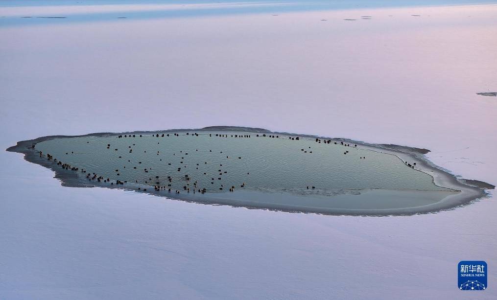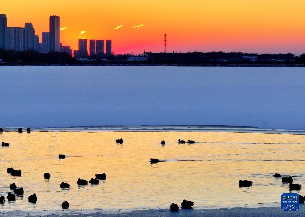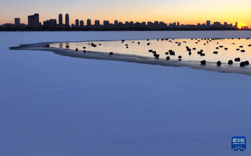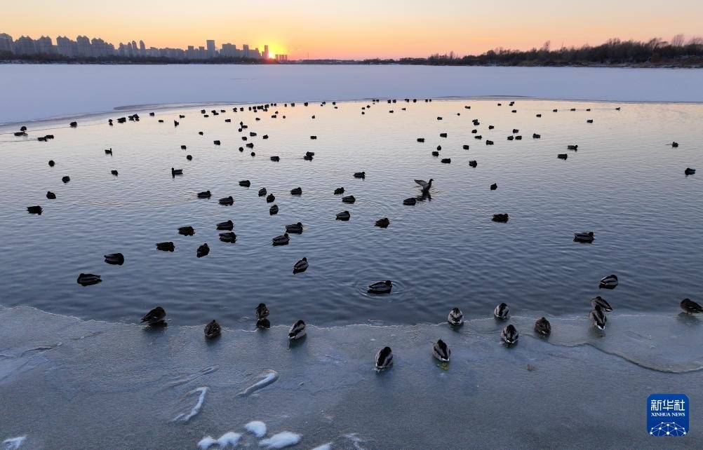 r11月27日,一群绿头鸭聚集在降雪后的松花江哈尔滨段未结冰水域觅食、休憩。落日金晖映照下,白雪、寒江和绿头鸭组成了一幅寒江“戏雪”画卷。